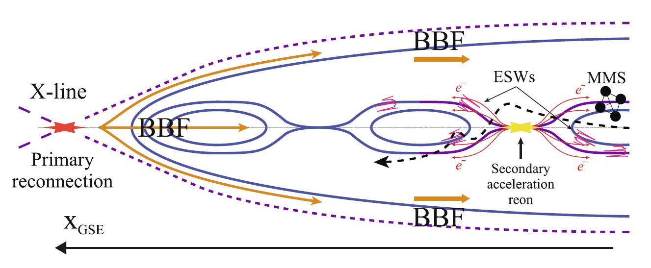 Приборы MMS зафиксировали в турбулентных плазменных потоках (BBF) всплески электрического поля до 100 мВ/м — рекордные значения для космоса. Эти электростатические уединенные волны (ESW) оказались связаны с узкими токовыми слоями и сверхэнергичными пучками электронов. Иными словами, внутри потоков возникают новые центры ускорения, формируя каскадный процесс преобразования энергии.