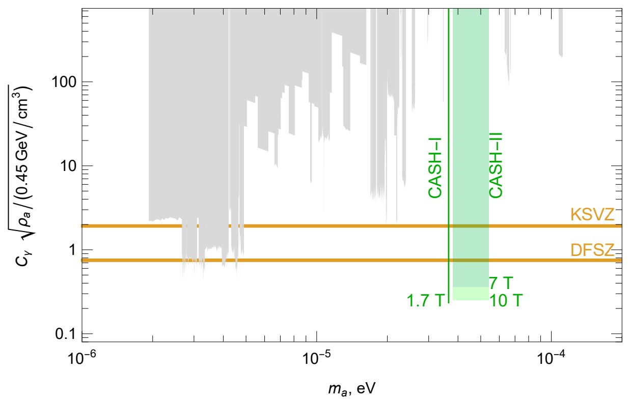 Проект будет реализован в два этапа. На первом, CASH-I, используется фиксированная медная полость и магнит с полем 1,7 Тесла. Даже на фиксированной частоте эксперимент за 12 дней превзойдет все существующие аналоги по чувствительности в этом диапазоне масс. Второй этап, CASH-II, предполагает более мощный магнит до 10 Тесла и возможность перестройки частоты резонатора. В течение года можно будет просканировать ранее недоступный диапазон масс аксионов от 38 до 54 микроэлектронвольт с чувствительностью, достаточной для проверки самых пессимистичных теоретических моделей. Графики из статьи показывают, что проект сможет исследовать «белые пятна» на карте параметров аксиона, недоступные другим мировым экспериментам.